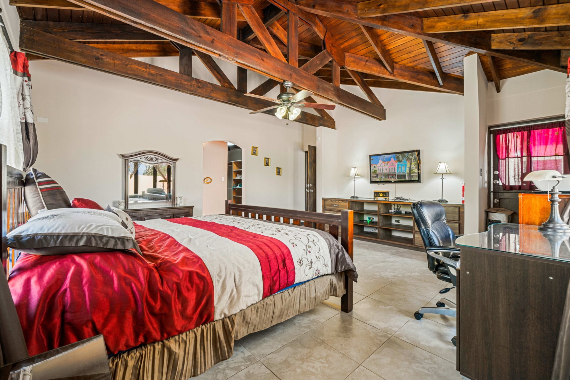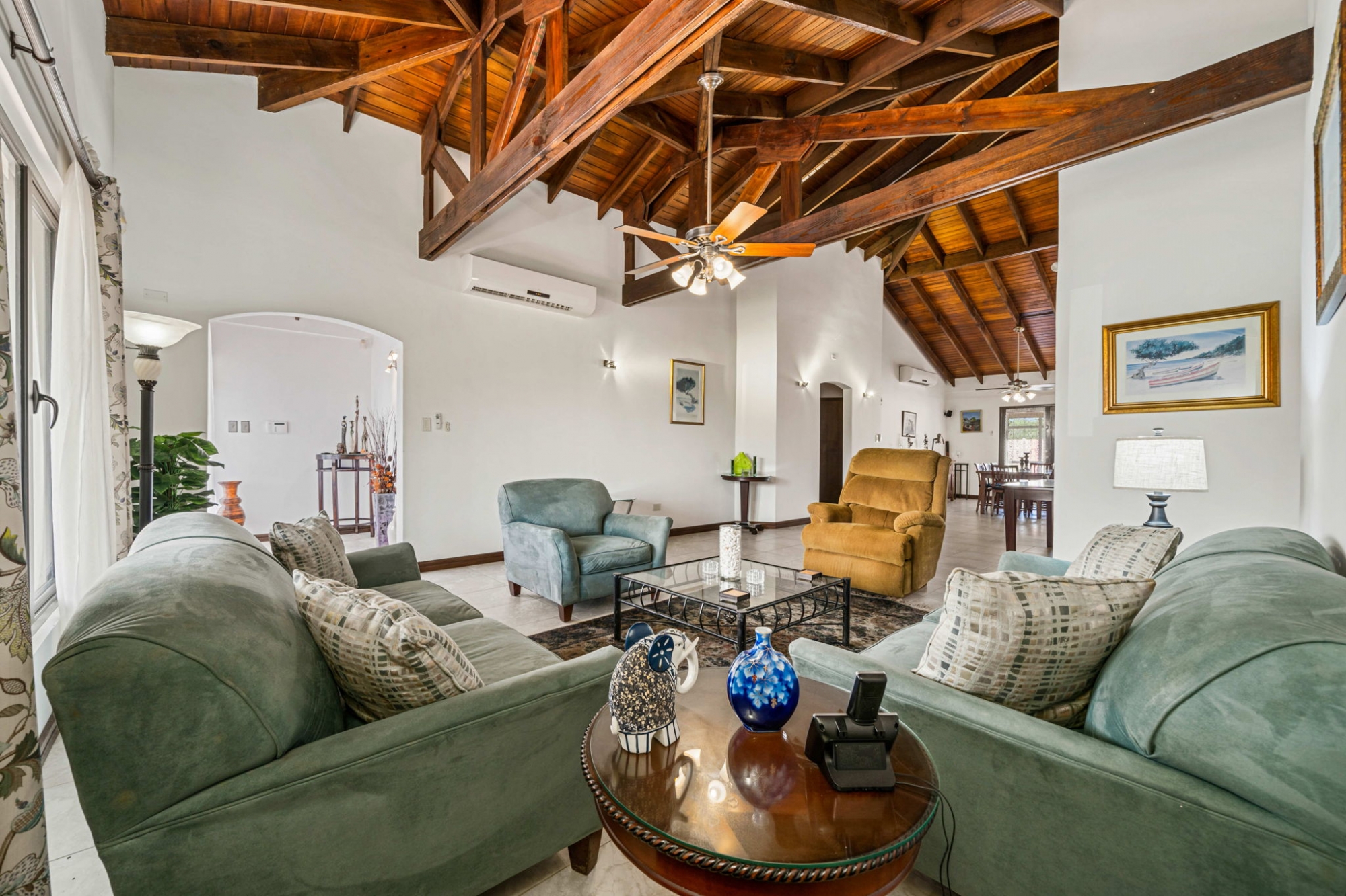 The home features four bedrooms and three and a half bathrooms, including a private guest suite located on the opposite side of the house, which is ideal for visitors or extended family. High cathedral ceilings throughout the interior create a spacious and airy atmosphere.