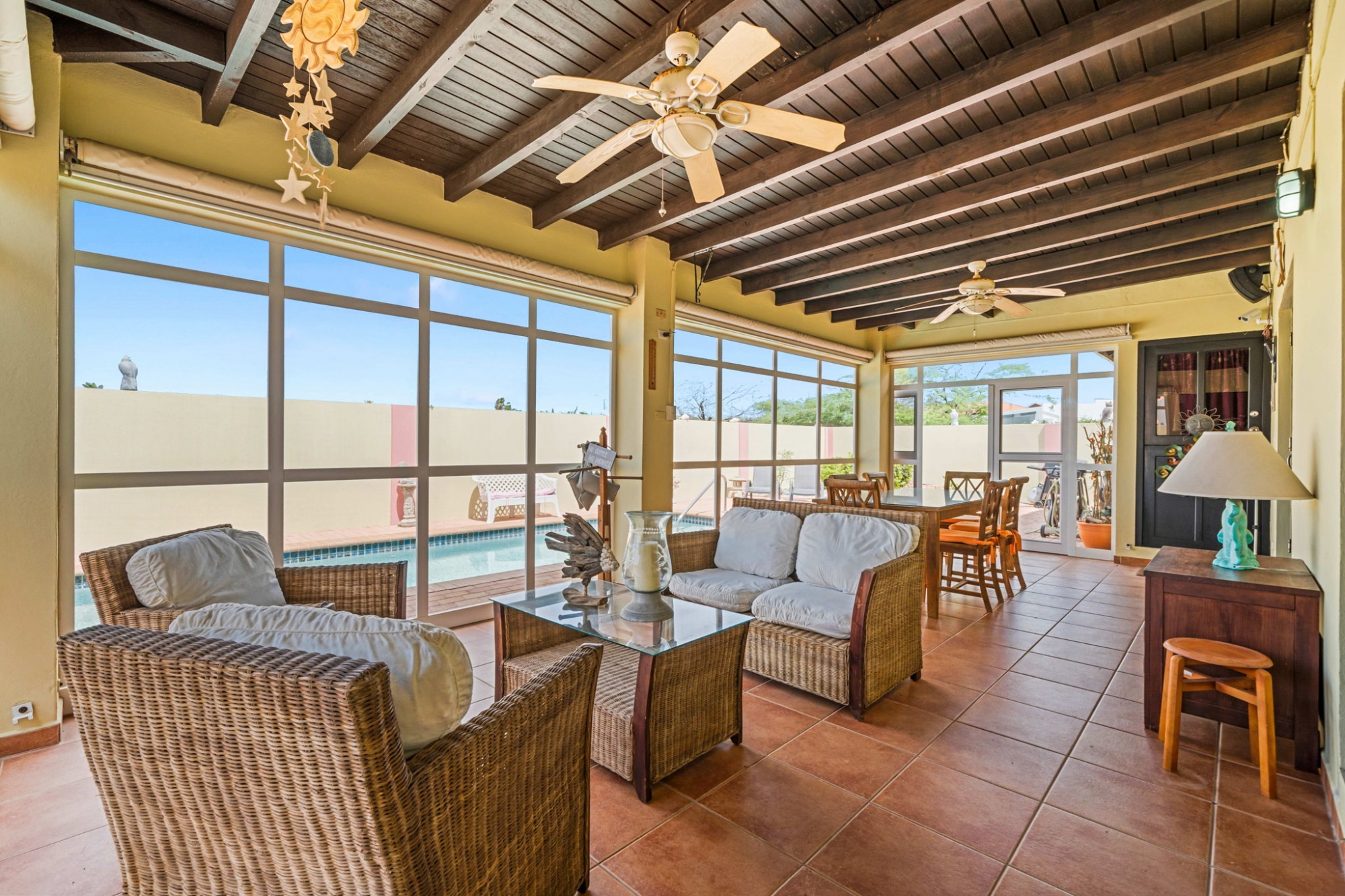 Additional features include a private swimming pool and a screened-in porch that allows for outdoor enjoyment in comfort. The property is equipped with a full-house generator, ensuring continued power supply when needed. There is a separate laundry room, as well as an additional storage room for convenience. The home is sold fully furnished and has been constructed with quality materials, offering a move-in ready opportunity.