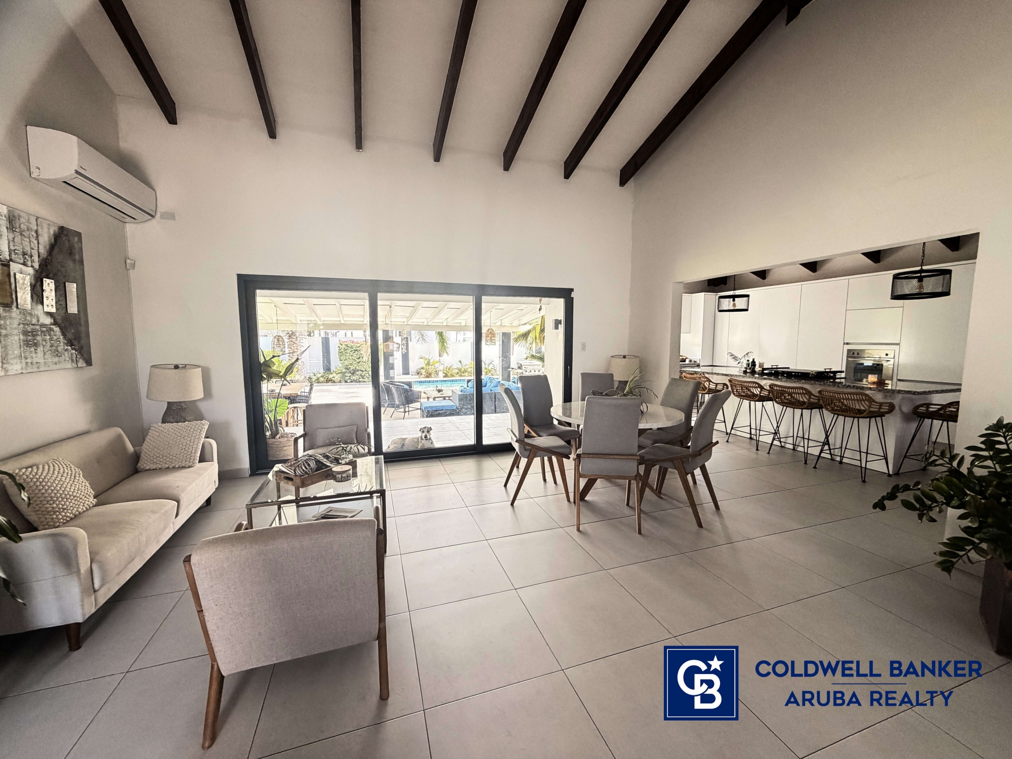 Step into the bright and spacious living room combined with a dining area, which opens up to a lovely outdoor patio. Here you will find comfortable lounge chairs, an outdoor dining area, and a refreshing swimming pool, creating the perfect setting to relax or entertain while enjoying Arubaâ??s beautiful weather.